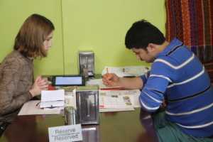 À Montréal, je participe au projet pilote de jumelage linguistique étudiants-commerçants de l’UdeM et de la Chambre de commerce. Le projet vise les commerçants immigrants qui habitent à Montréal depuis plusieurs années mais ne parlent pas (ou peu) français. Chaque semaine, je passe ainsi 2 heures chez Mustafa. Il est ouïghour, il vient du Turkestan (une province chinoise) et il tient un petit restaurant.