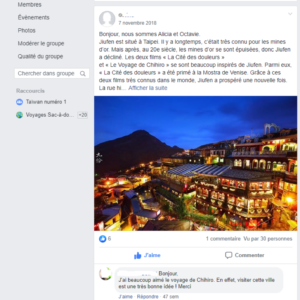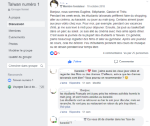 Notre activité consistait à écrire un article pour la page Facebook de la classe. Tout d’abord, la classe avait choisi un nom de groupe en français et en chinois ainsi qu’une photo et un court article pour présenter la classe et le projet. Ensuite, nous avons imaginé ensemble les thèmes sur lesquels les apprenants aimeraient écrire dans le cadre de cette activité. Tout était en lien avec Taïwan : il s’agissait d’une pré- sentation culturelle parce qu’elle s’avérait plus intéressante pour les francophones et pour que les ap- prenants connaissent ce sur quoi ils devaient écrire.