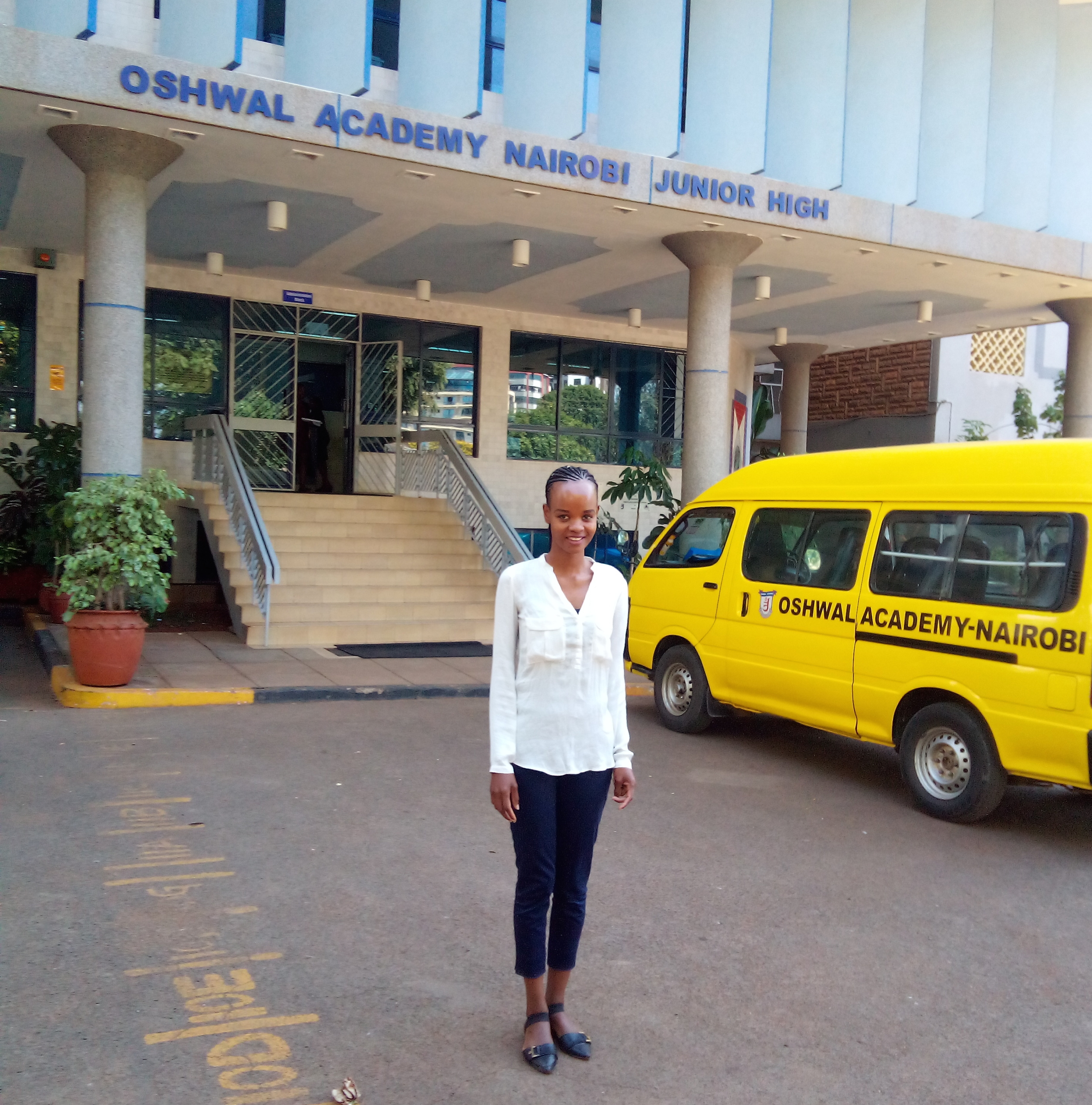 Winnie devant l’établissement où elle enseigne à Nairobi.