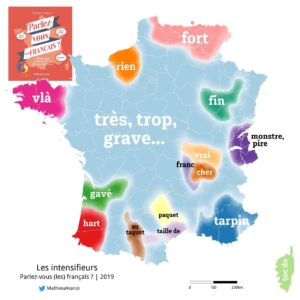 Par exemple, et en rapport avec le rap, on peut en classe travailler sur la carte des intensificateurs. Sur la carte présentée en 2019, les particularismes régionaux dessinent une carte très variée : l’auteur, d’ailleurs, pour annoncer cette carte sur les réseaux sociaux, prend un ton parlé “Très, trop, grave, gavé, tarpin… dis-moi comment tu intensifies je te dirai d’où tu viens. Quelle est votre team ? » Le terme « tarpin » peut être recherché dans